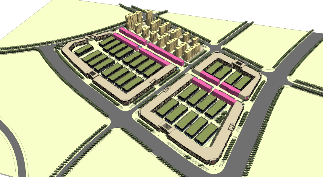 本項目總體布局分三個層次:第一層次為地塊北面緊鄰322國道,商業價值面最高,建議水泥路左側緊鄰國道處規劃箱體式建筑(預計引進主力品牌店紅星美凱龍家具建材賣場);水泥路右側沿國道處規劃三層商用物業,一層為臨街通鋪,二、三規劃商務酒店、辦公物業等;第二層次在地塊中間,以專業市場鋪面及冷庫、大車停車場功能規劃為主;第三層次為項目地塊東南側,緊鄰山體,自然環境較好且安靜,規劃高層居住物業。