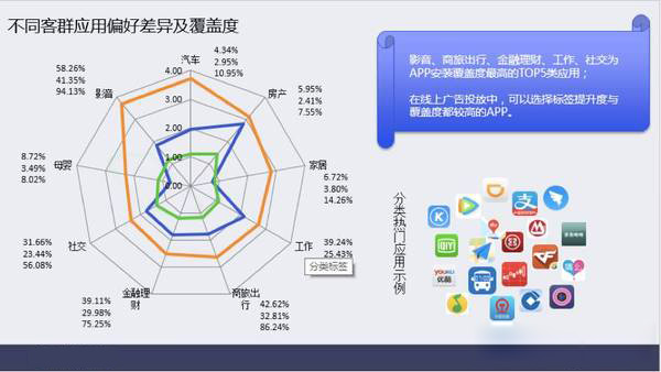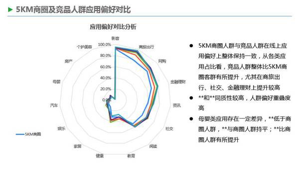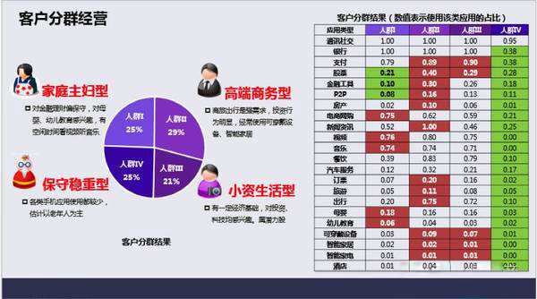 在對商圈人群完成360度用戶畫像后,可從不同維度實現對人群的分類管理。在已有的實踐嘗試中,年齡、婚姻狀況、車輛保有情況、性別、設備品牌、應用偏好都可稱為進一步交叉分析、聚類分析的基礎維度。結合該商業地產企業的自身需求,華錦億爵大數據技術團隊以線上應用偏好作為最重要的聚類基礎,將商圈內人群分為偏好差異明顯的幾種不同類型,從而便于把握不同類型客群的消費特征,為商業主力客群的選定準備了有力的數據支持。