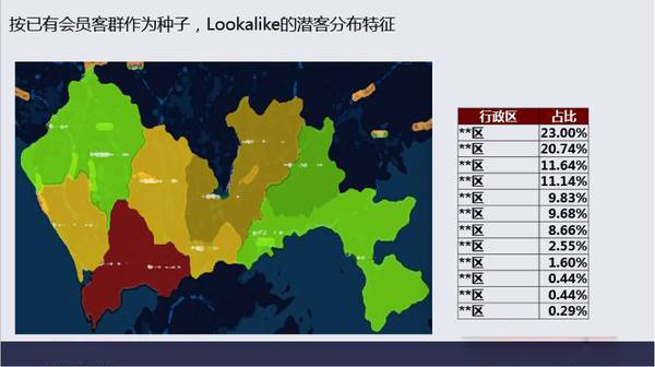對開發企業而言,已有項目的運營操作經驗可復制性高,但在前期定位階段對不同商圈的認知往往無法復制。結合大數據工具和lookalike算法技術,企業已積累的消費客群將成為重要的種子數據,以此作為學習對象,將快速模擬出在不同商圈內的潛客分布情況。這一重要突破將快速建立項目定位和目標客群間的映射關系,極大提升企業入駐陌生商圈的成功率。