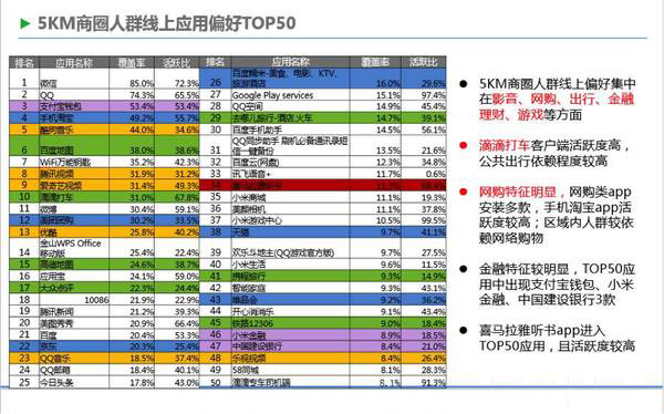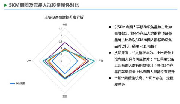 圈取商圈及競品地理圍欄,獲取到的移動設備數據可實現與數據中心關聯匹配,通過用戶畫像描述其人口屬性特征、設備使用特征、線上應用偏好及線下行為軌跡,更準確地了解商圈人群及競品客群屬性。